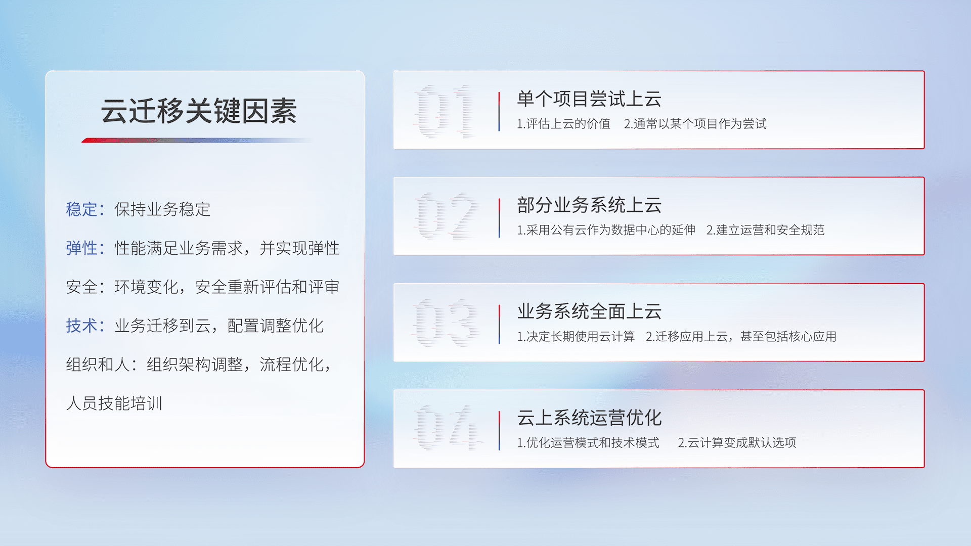 结合实际业务,,,,从规划设计、、云平台选型、、云原生改造、、、数据迁移、、集成交付,,迁移全过程为客户识别最佳上云路径,,,做好风险识别管理,,设计网络架构、、身份权限、、、安全审计合规、、、、操作审计、、、、日志审计、、监控告警策略、、、、多站点容灾设计等,,,,对云上基础设施进行整体规划,,,提升IT治理水平,,,,以满足弹性、、、高可用、、、高性能的需求。。。