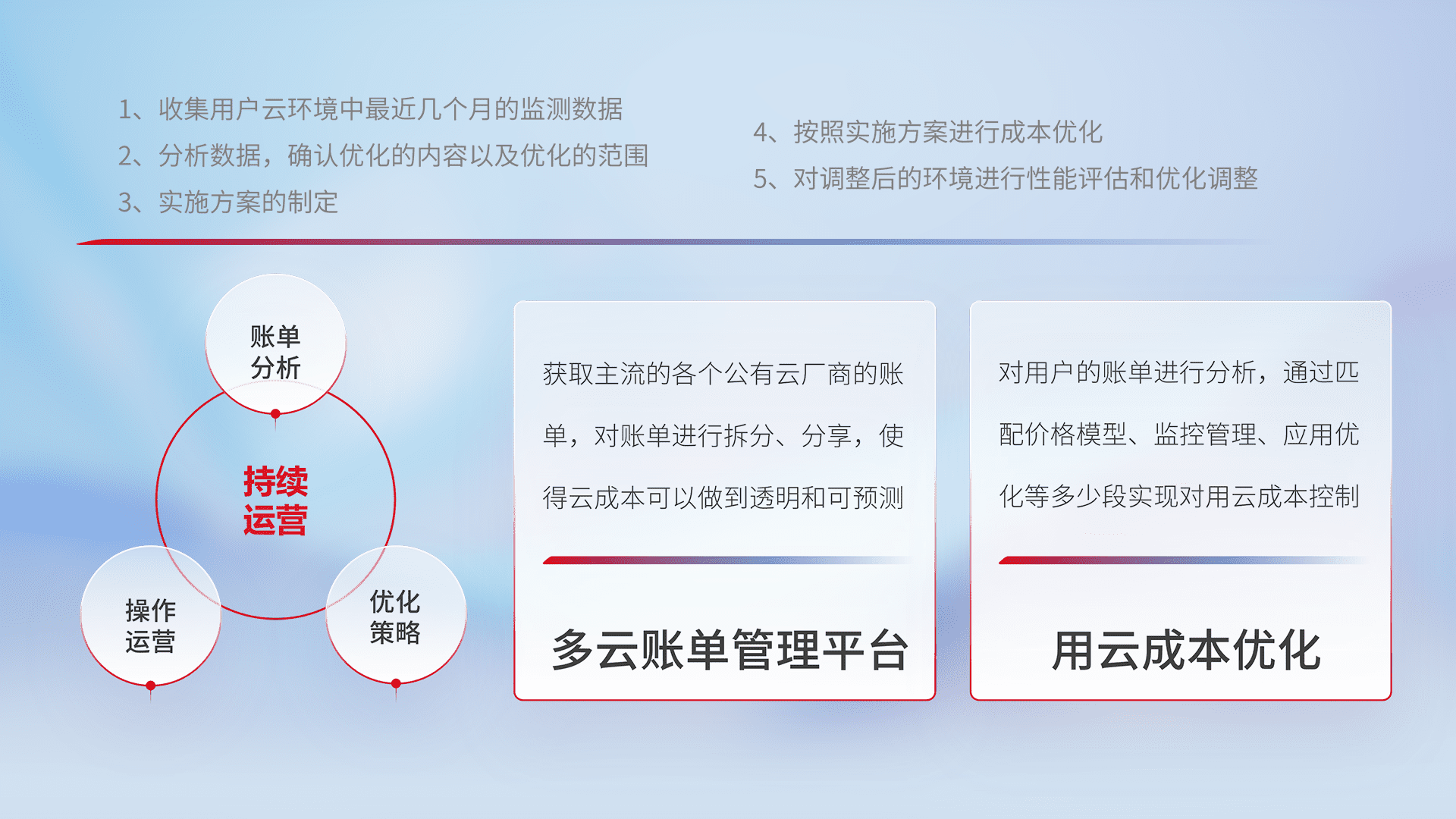 通过多云纳管,,,以统一的资源数据模型把客户的云资源进行抽象和封装,,,进而实现对多云资源的统一操作,,,保障云资源管理的可靠性、、、稳定性与可用性。。。量身定制化运维内容,,配置、、开发运维、、、、补丁管理、、、、备份、、、、监控、、认证和访问管理、、审计和日常巡检等,,保障在用云过程中的可靠度,,,稳定度以及高可用率。。。。