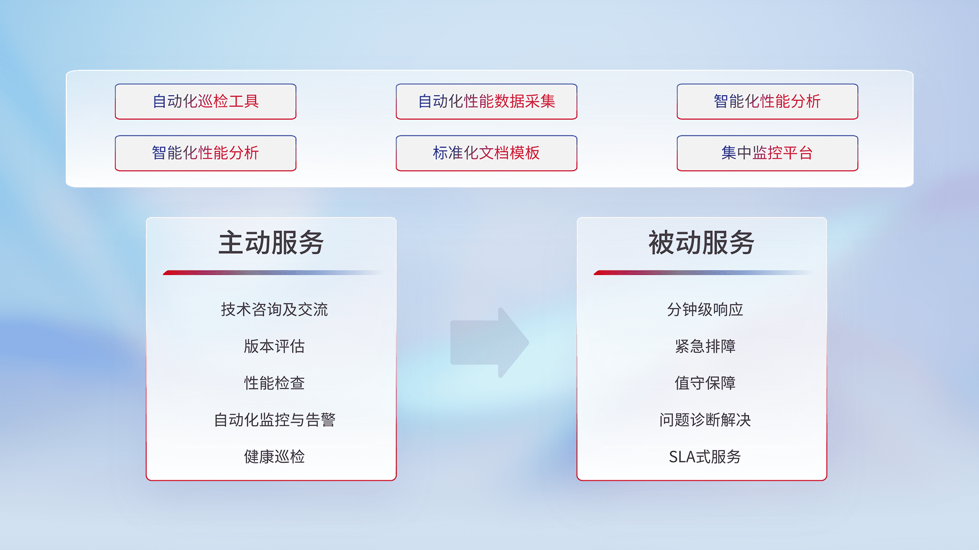 智能化工具和标准化文档,,,保障服务质量,,,提供主动服务(包含技术咨询、、、版本评估、、、性能检查、、自动化监控与告警、、健康巡检)和被动服务包含(分钟级响应、、、紧急排障、、值守保障、、、问题诊断解决、、、SLA服务)。。